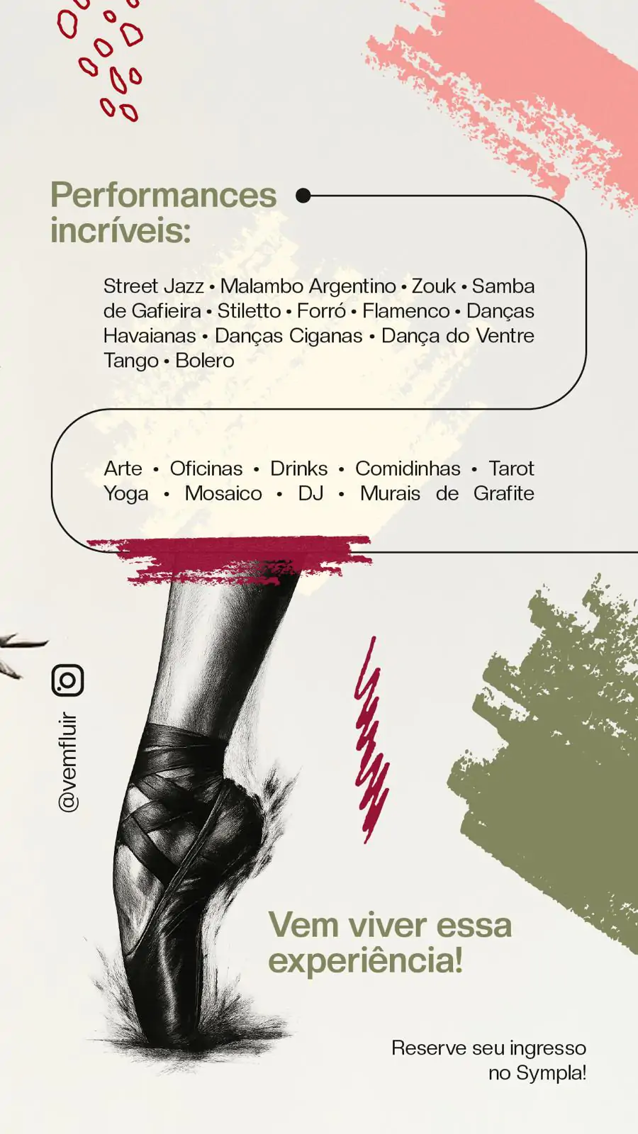 Finalmente em Belo Horizonte um evento que reúne danças artísticas e outras atividades participativas voltadas ao bem estar e a arte, oficinas de yoga, Mosaico, macramé e danças, em um ambiente aconchegante em clima de evento! São muitas atrações em um só lugar! Será uma delícia passar a tarde em volto de tantas novidades!