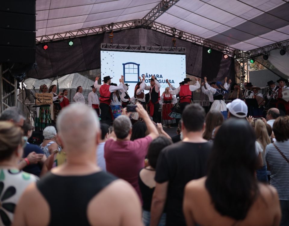 Gastronomia típica portuguesa, música tradicional, danças folclóricas, apresentações culturais, artesanato.
