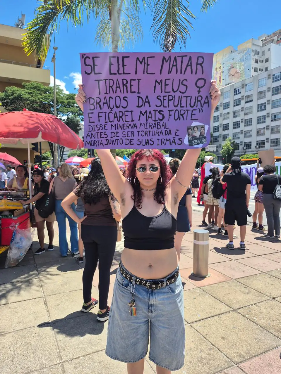 Entre as participantes estava a psicanalista, escritora e ativista feminista Denise Coimbra, de 60 anos, que veio de Bom Despacho (MG) exclusivamente para participar do protesto. Para ela, a mobilização se impõe diante da gravidade do cenário atual.