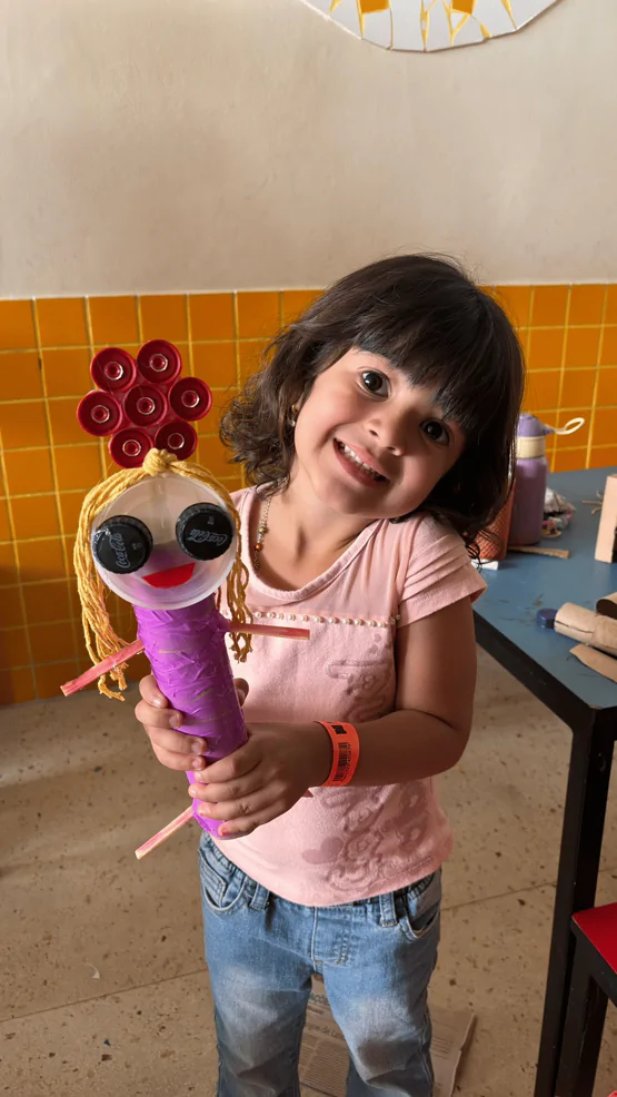 Em uma grande mesa de invenções, materiais reaproveitados (tampinhas, rolos, caixas, tecidos, barbante) se transformam em brinquedos criados pelas próprias crianças. A oficina reforça sustentabilidade, autonomia criativa e a ideia de que brincar também é inventar com o que se tem à mão.