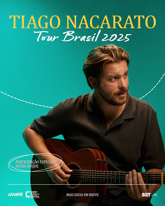 O cantor e compositor português Tiago Nacarato está de volta ao Brasil para sua quinta turnê nacional. Entre os meses de outubro e novembro de 2025, o artista passará por 12 capitais brasileiras, levando seu repertório autoral, releituras marcantes e a sonoridade que une Portugal e Brasil em um elo artístico cada vez mais consolidado. Nesta nova passagem pelo país, ele estará acompanhado pelo talentoso trompetista Diogo Duque, também português, conhecido por sua versatilidade e colaborações com artistas como Marcelo Camelo e Marisa Monte.