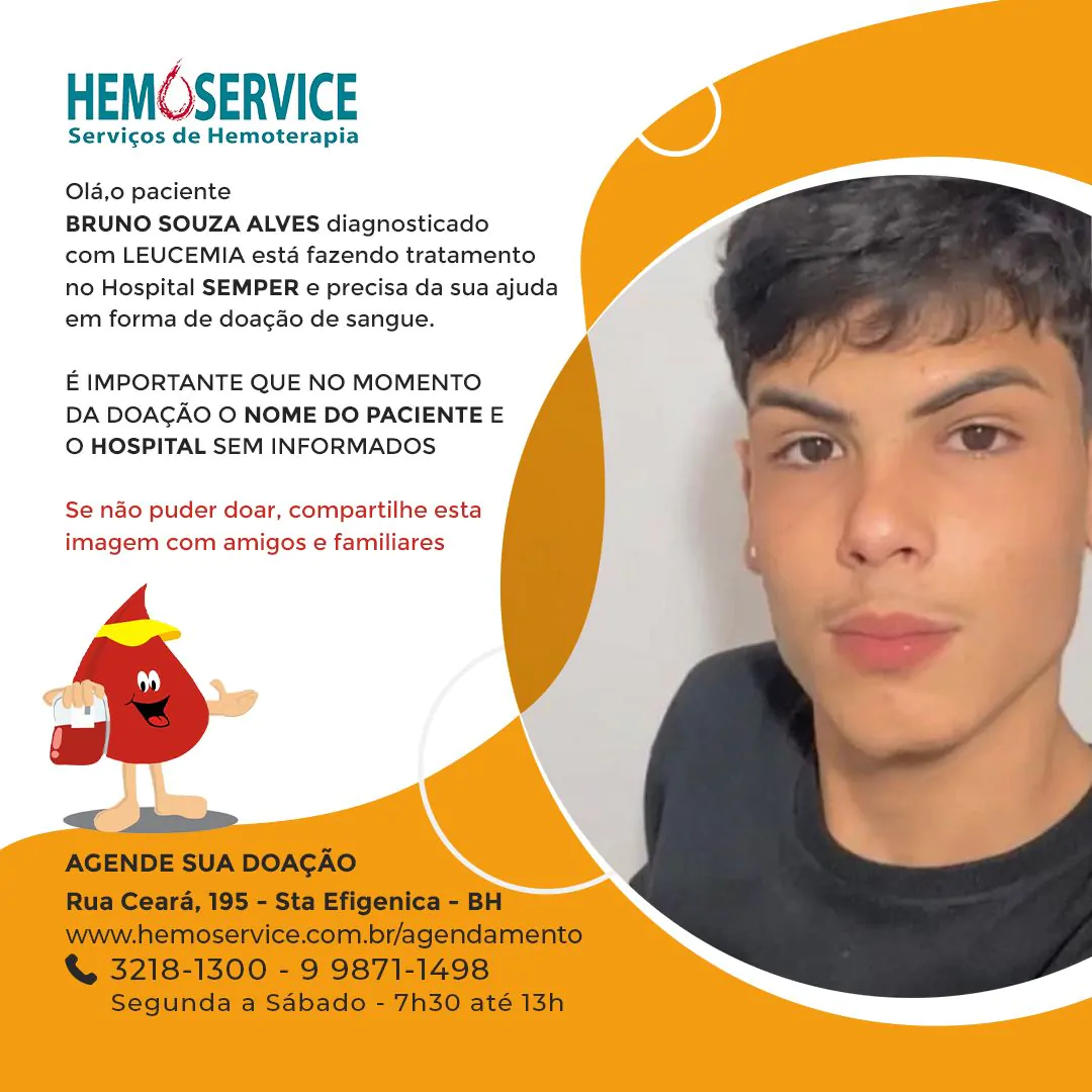 Uma campanha para incentivar a doação de sangue para Bruno Souza Alves, de 18 anos, que está internado no hospital Semper com leucemia em estágio avançado, mobiliza uma família de Belo Horizonte.
