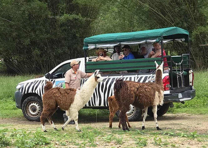 Logo na chegada à área do safari, os participantes foram surpreendidos pela presença de flamingos nas lagoas uma das imagens mais encantadoras da visita. Ao longo do trajeto, puderam avistar de perto zebras, antílopes, lhamas, avestruzes, búfalos, tartarugas, araras, macacos, grou-coroado, pavões, emas, porcos-do-mato e antas, todos vivendo em harmonia em um ambiente de preservação e cuidado ambiental.